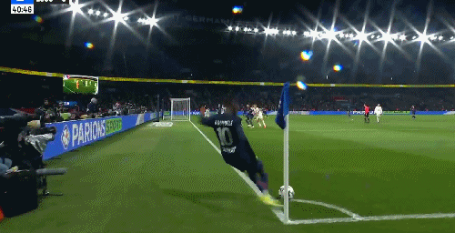 第41分钟,登贝莱角球直接转向球门,皮球击中近角边网